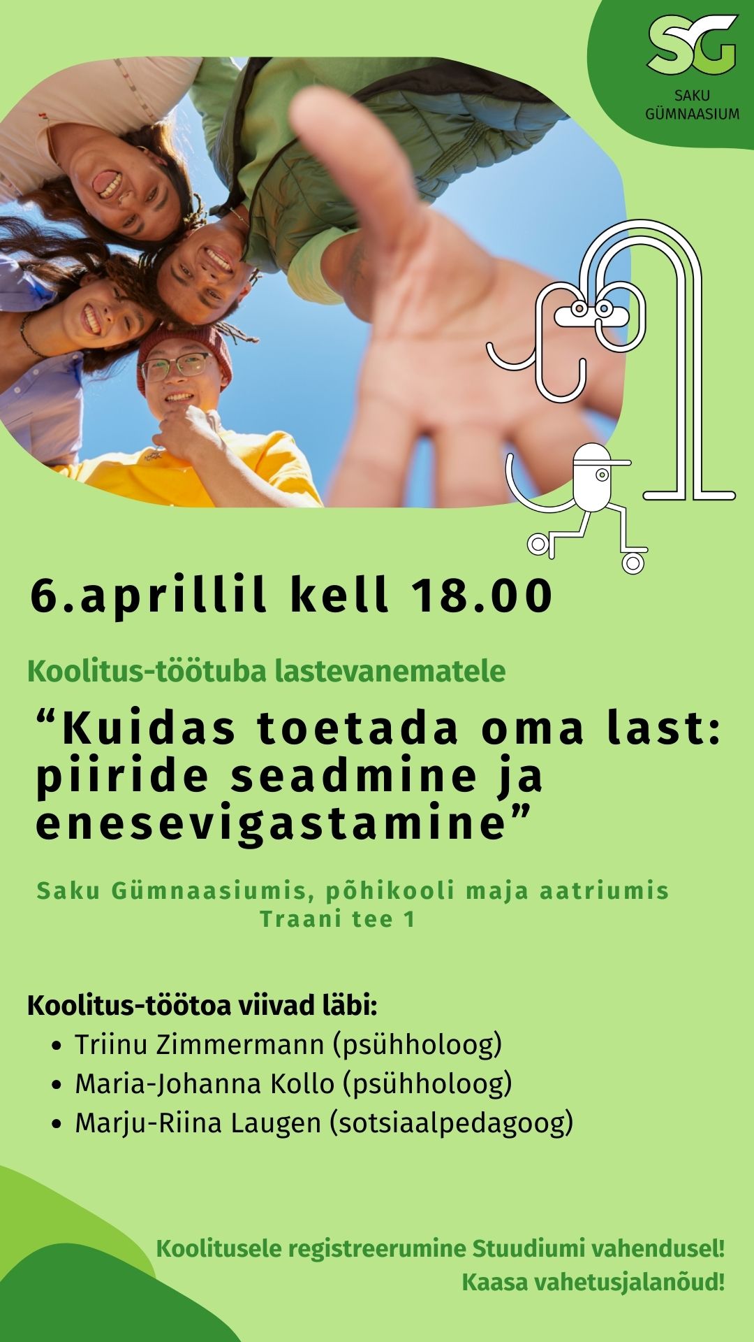 6. aprillil kell 18.00 toimub Saku Gümnaasiumi põhikooli majas (Traani tee 1) koolitus-töötuba lastevanematele „Kuidas toetada oma last: piiride seadmine ja enesevigastamine“.