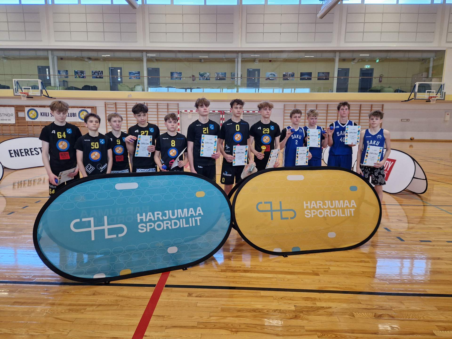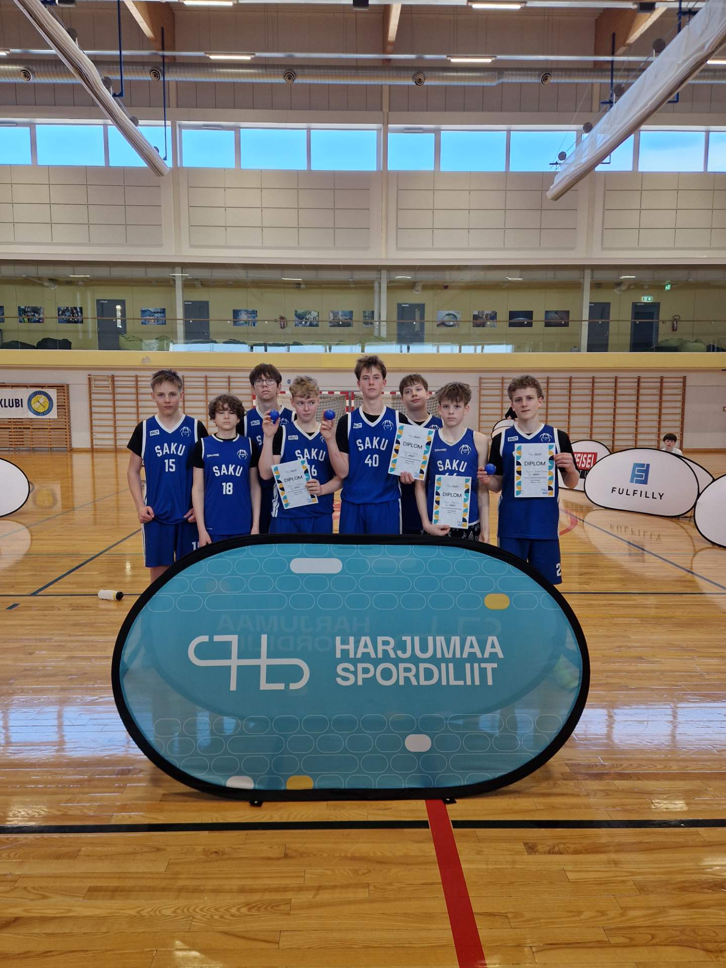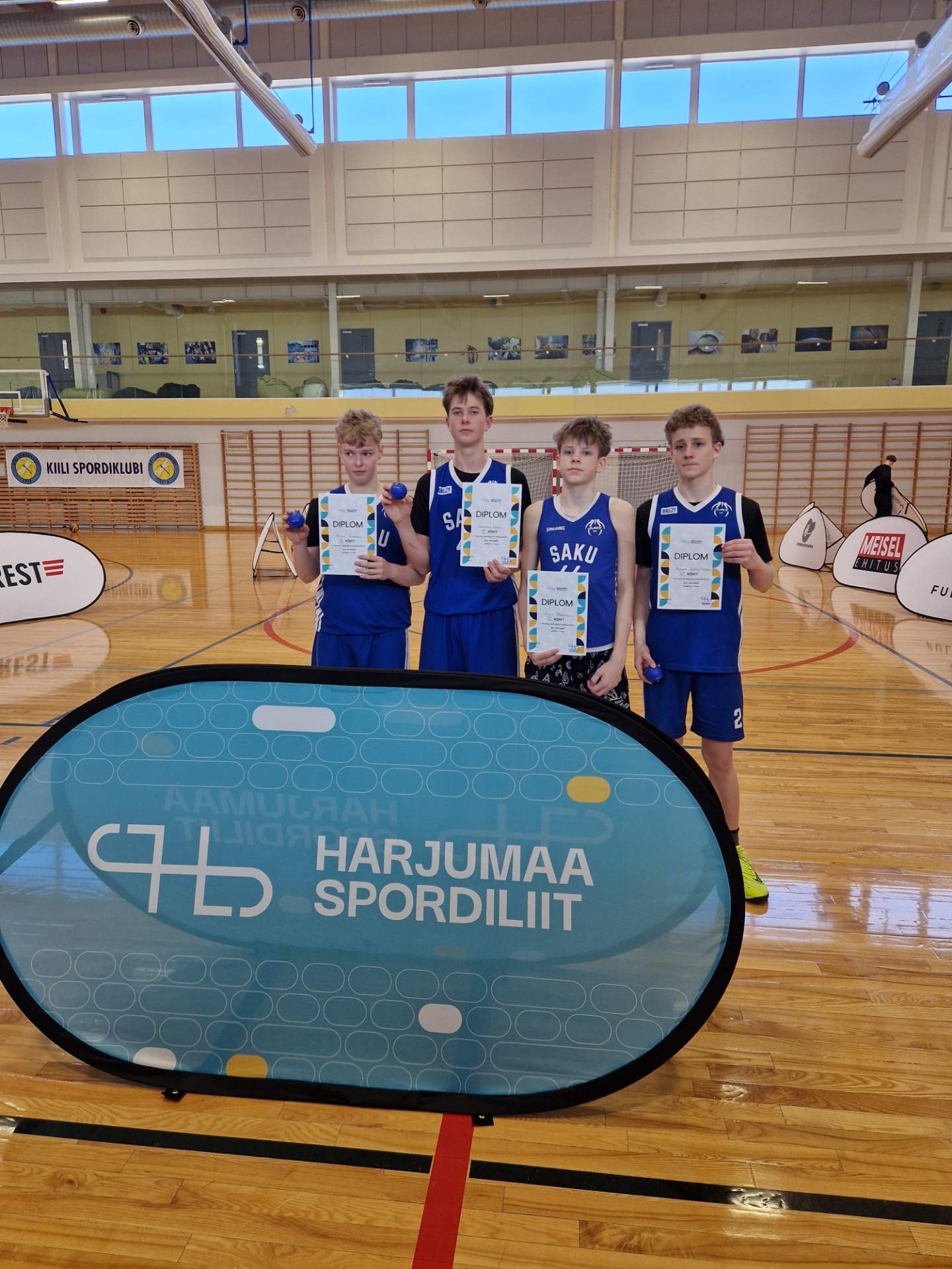 Teisipäeval, 24. märtsil toimusid Kiili spordihallis Harjumaa koolide 3×3 korvpalli meistrivõistlused 6.-7. klassi poistele. Saku Gümnaasium oli taas esindatud kahe võistkonnaga. Kõige paremini läks meie kooli esimesel võistkonnal, kes saavutas väga tubli 3. koha. Võistkond mängis koosseisus pildil vasakult Mario Uuesalu, Sandro Lohk, Axel Mäeots ja Holger Johann Avango. Kolmanda koha mängus alistas Saku Gümnaasiumi I võistkond Kose Gümnaasiumi esinduse tulemusega 15:13. Saku Gümnaasiumi II võistkond saavutas võistlustel 9. koha (kokku osales 13 kooli). Võistkondi juhendas õpetaja Märt Raam.