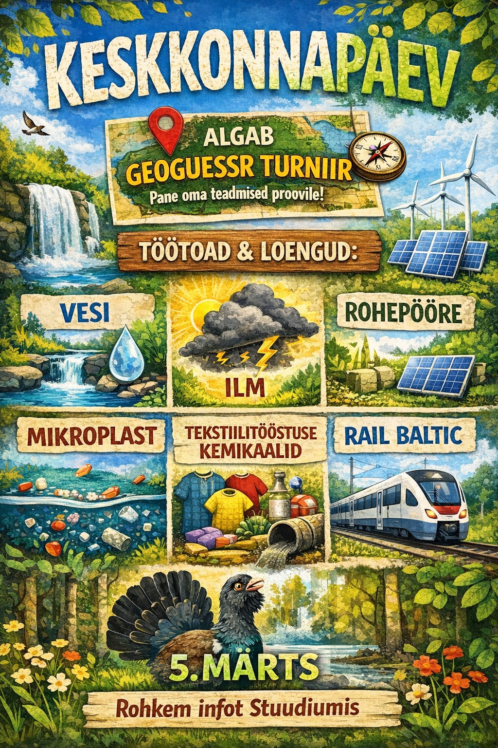Rail Baltica teemalises töötoas arutleti suurprojekti mõjust elukeskkonnale. Rõivatööstuse ja kemikaalide keskkonnamõjudest rääkis Merliin Laos, suunates noori mõtlema teadlikumatele tarbimisvalikutele. TalTechi töötoas „Füüsika ja rohepööre“ arutleti teaduse ja tehnoloogia rolli üle kliimamuutuste leevendamisel Raavo Josepsoni juhendamisel ning Tallinna Ülikooli professor Jaanus Terasmaa rääkis vee tähtsusest ja selle kestlikust kasutamisest.